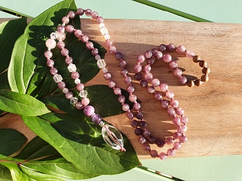 - Materialien: Lepidolith, Rosenquarz, Sandelholz, Phosphosiderit, Lavendelquarz, 925er Silber, Naturseide
