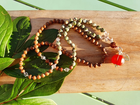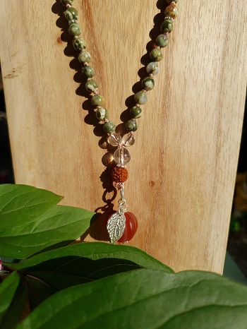 - Materialien: Regenwald Rhyolith, Sandelhoz, Bergkristall, Rudraksha, Karneol, 925er Silber, Naturseide